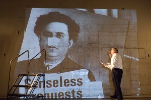 Kentridge hikaye anlatımı sürecinde elindeki dosyadan bazı sayfaları yerlere atarak kendi bedeninden ayrılan burun imgesini sahne üstünde görsel olarak yeniden üretiyor. Bunun hemen ardından Kentridge’in kendi görüntüsü projeksiyonla sahnenin arka duvarında bulunan perdeye yansıtılıyor. Bu görüntüdeki Kentridge’in kıyafet ve aksesuarları sahne üstündekiyle aynı. Dolayısı ile kendi bedeninden tamamen çıkmak isteyen başka bir Kentridge imgesi yaratılmış olunuyor, üstelik projeksiyonla yansıtılan Kentridge imgesi her defasında adım adım kamera kadrajından çıkmayı başararak kendinden kaçma izleğini sürdürüyor. İki katmanlı bu bölüme daha sonra üçüncü bir Kentridge görüntüsünün dahil edilmesi, İki görüntüdeki Kentridge’in birbiriyle iletişime geçtiğine tanıklık edilmesi, sahne üzerinde bulunan Kentridge’in görüntüdeki Kentridge ile somut olarak ilişki kurduğuna dair sahne üzerinde bir ilizyon yaratılması, hem görsel olarak sahneye canlılık kazandırıyor, hem de metinlerarasılık fikrinin nasıl görünür kılınacağına dair çok yaratıcı bir buluşu ortaya çıkarıyor. Gogol’den Cervantes’e yol alan hikaye ile metin içinde metin hayat bulurken, sahne üzerindeki varlığından projeksiyon perdesindeki varlığına doğru kendini çoğaltan Kentridge görüntüsüyle görsel bir metinlerarasılık işleniyor.
