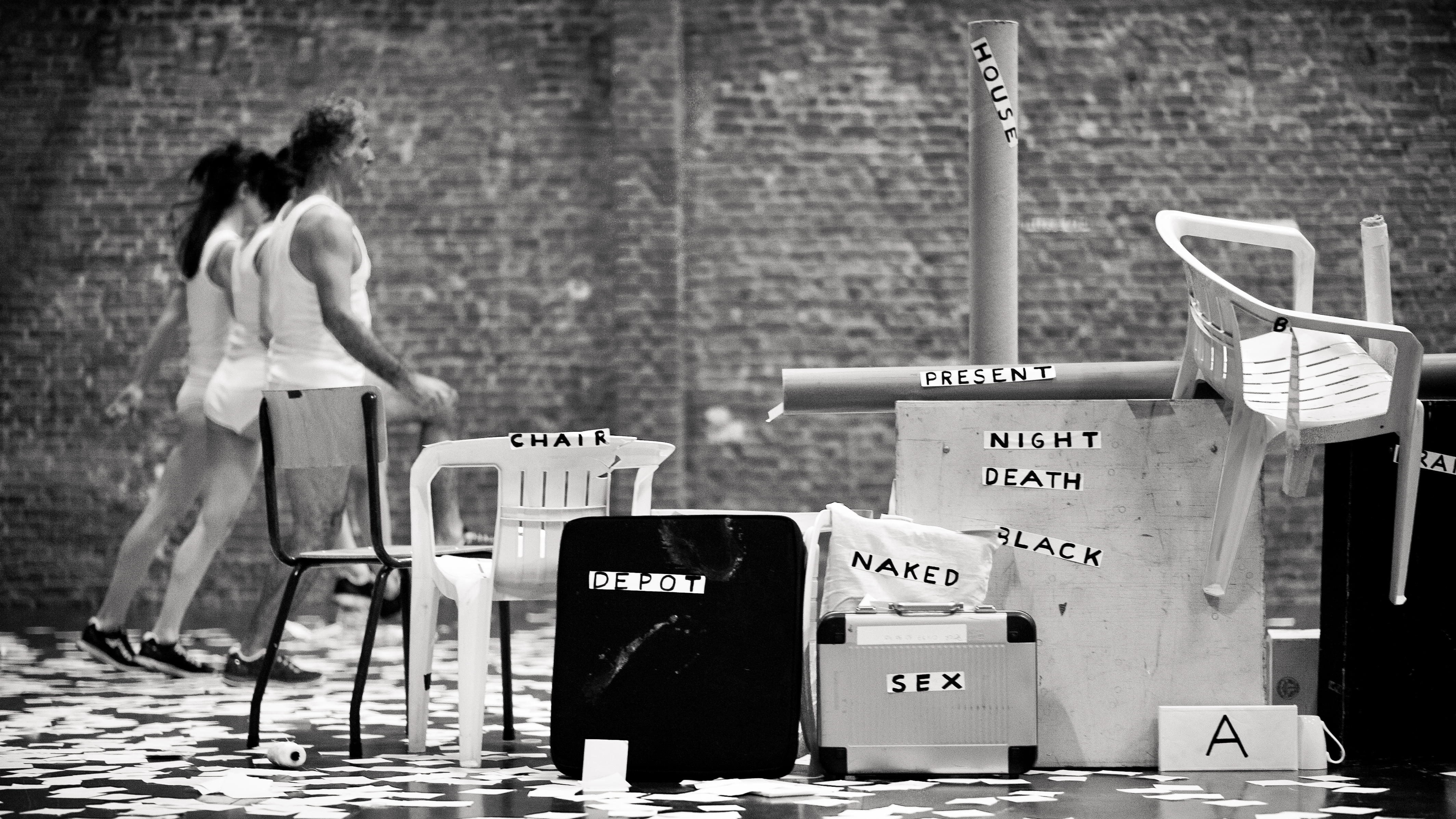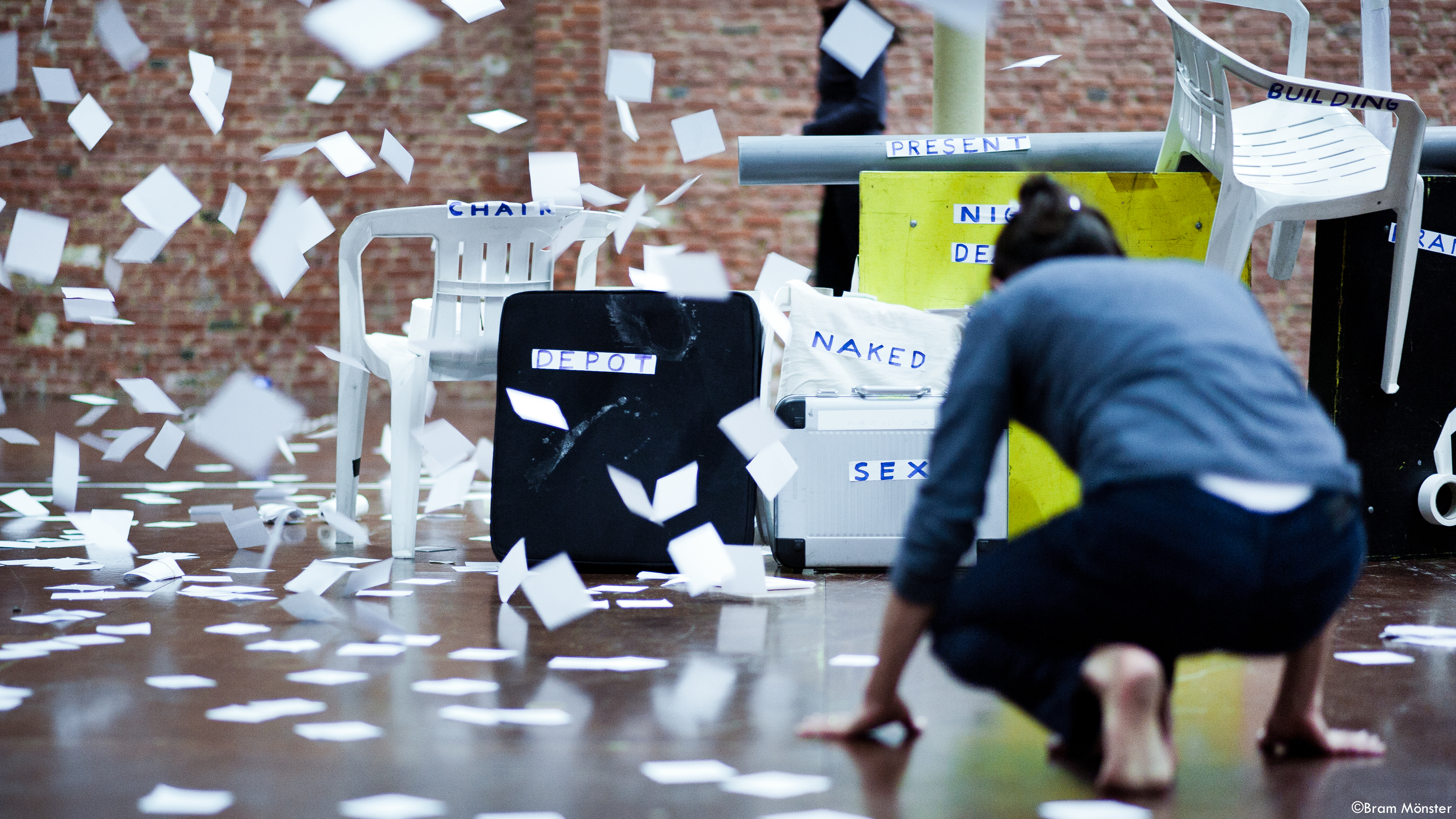 M.K: Bu oyunda Portekizli bir arkadaş, Vanya Rovisco var. Filiz, ben ve o üç kişiyiz. Oyunu Berlin’de oynarken Fransa’dan bizim bütün işleri bilen Claire Verlet -şu sıralar tiyatro Theatre de Ville’in başında- Paris’te… Bize çok destek olmuştu zamanında. O dedi ki işin içerisinde kısmen sizin eski işlerinize referans veren yerler var bu son oyunda da. Aslında başından beri yaptığımız işlerdeki unsurlar buralara kadar akıyor. Bu hem korelasyonun getirmiş olduğu genişleme, hem kendi zihinlerimizdeki evrilme ve süreci kapsıyor. Son zamanlarda konsept yoğunluklu işlerde hala fizikselliği belirgin, bizim mimar-mühendis olarak dahil olduğumuz bakış açıları var… Ya da işçi bedeni diye kullanmış olduğumuz formun izlerini görebiliyoruz ama artık o ilk başlangıçtaki gibi değil. Daha başka bir şeye evrildi. Metin var, objeler var filan. Daha tiyatroya doğru biraz kaydı, özellikle son işte.