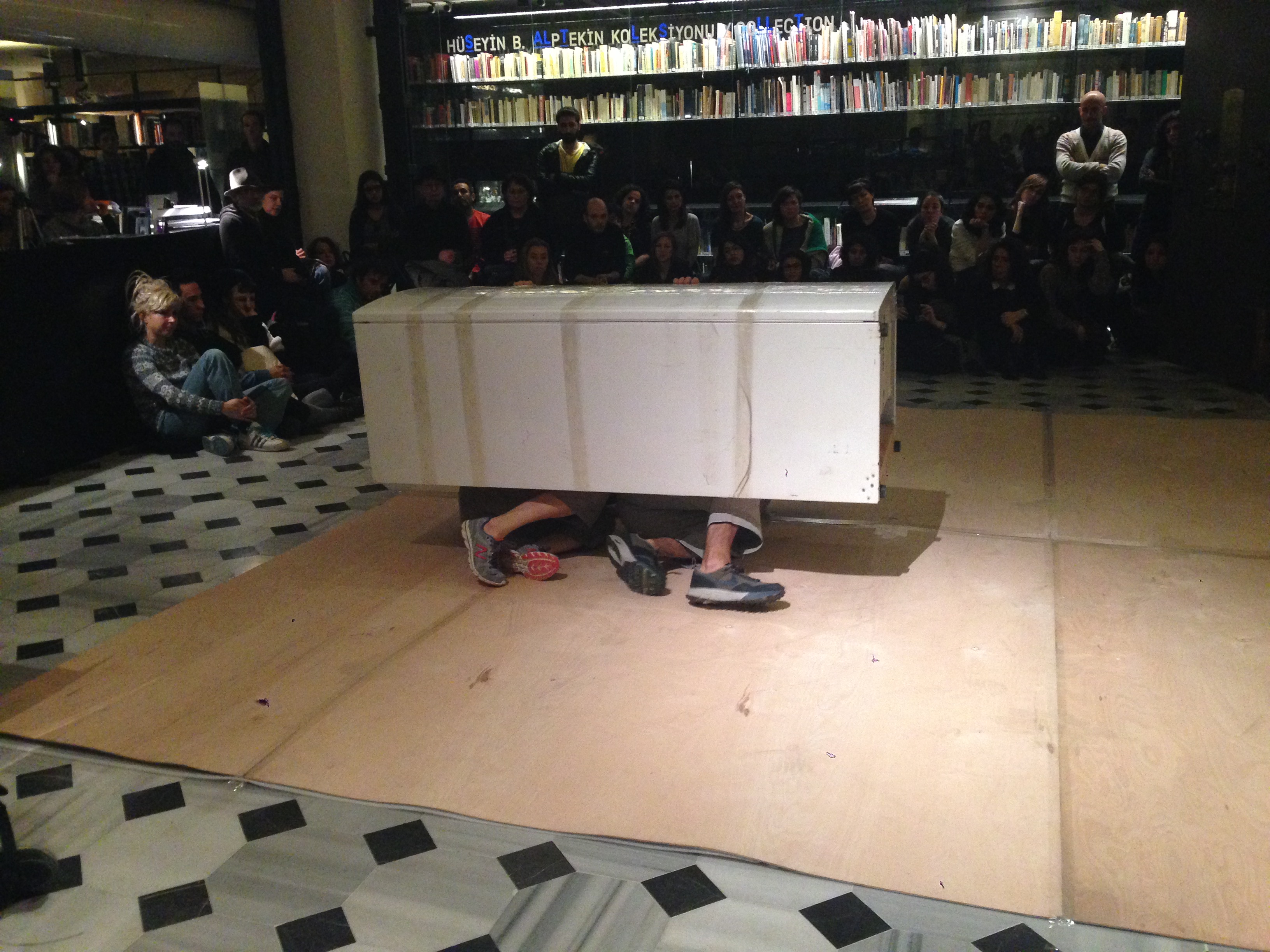 M.K: O zaman ben Şehir Tiyatrosunda TAL2‘de çalışırken enerji dramaturjisi, iş yapan beden vs. böyle şeyler üzerine çalışıyorduk. Ve aynı zamanda hem fiziksel olarak hem de fizik kuralları üzerine çalışıyorduk. Duvara gidip geldiğimiz bir oyun vardı. İşte ‘yansıma, çarpışma’ vardı. Düşme, momentum, çarpma… Fizikle ilgili her şey. Yansıma gibi şeyler kullanıyorduk. Bir yerden bir yere taşınma esnasında dolap en büyük objedir. İki işçinin bir merdivende bir dolabı indiriyor olma hali. Yani o dar merdivenlerden iki kişi onu nasıl tutar da indirir? Bu benim için etkileyici bir resimdi. Bizim merakımız olan ‘iş yapan beden’, ‘enerji dramaturjisi’ ile de uyumluydu. Önce biz bir mekanda dolabı alıp bir yerden bir yere taşımayla başladık. Sonra o taşıma esnasında baktık ki dolap kendi kendine düşüyor, yuvarlanıyor filan. Bunu işin içine almaya başladık. Kendiliğinden bir vücut girdi işin içine. Aslında birbirimizle çalışmadık, daha çok bedenle buzdolabının karşılaşması. Ve bir bina içinde buzdolabı da büyük bir obje. Bizde biraz mimari bir algı da yarattı. Küçük olsa elinle filan da bir şeyler yaparsın ama büyük olunca bir alan yaratıyor, mekan yaratıyor. Üstüne çıkabiliyorsun, üstüne alabiliyorsun. Dolayısıyla iş bedenle mimari ilişki konusuna kaydı.
