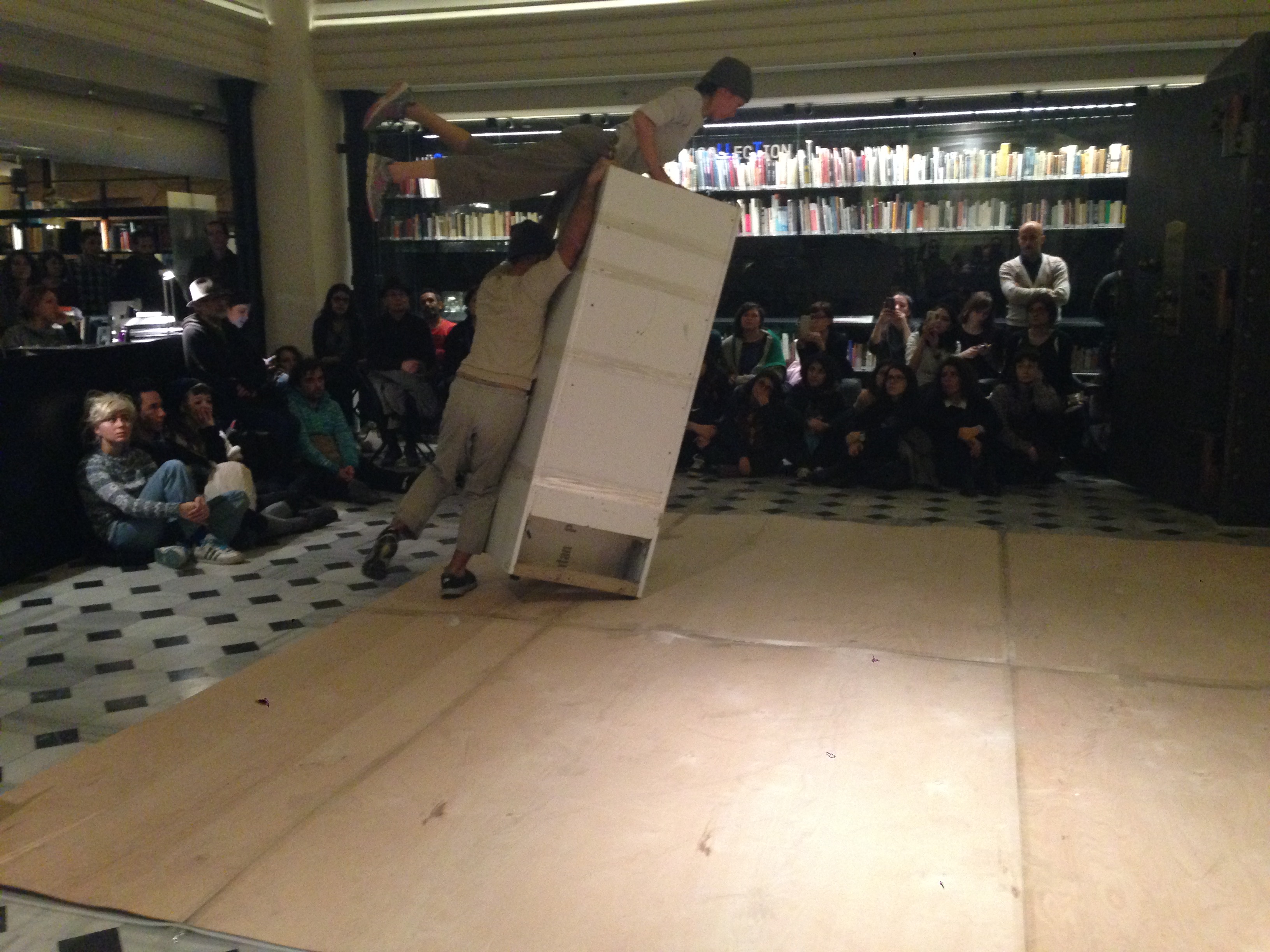 F.S: Yani dolabın ayağından tut, kontrplağın yamuk olmasına kadar her şey değişiyor. Atina’da – belki 10 yıl oluyor- oynadığımızda dolabın tekerleğinin bir tanesi gösteri esnasında yuvarlanarak gitti. Oyun sırasında Mustafa’yla birbirimize baktık ne yapıcaz diye. Ters çevirdik, başaşağı oynadık, üç ayak yukarıda. Böyle versiyonlar oluyor işte. Oyun koreografik olarak aynı ama onu canlı kılan işte dolabın kendi fiziksel özelliği. Çünkü bozulan, şu an kullanılmayan ama nihayetinde bir makina olarak tasarlanmış bir obje. O yüzden kendine ait bir biçimi var. Bir kere öyle bir çözüm bulduk. O artık bir şekilde, o an karar verdiğimiz bir şeye dönüşüyor.